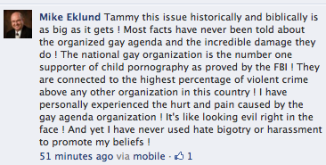 You’re fully entitled to your beliefs but to post such comments on Facebook just goes to show how hurtful you are to your own Christian foundations. I’m sorry to be the bearer of bad news, but people like you are the reason why Christians have such bad reputations. I know incredible people of faith who don’t always believe my lifestyle is acceptable, but that doesn’t keep them from accepting me as a person. To say that gays are a part of an agenda to promote violence and child pornography is just ridiculous and goes to show that you don’t really even know who we are.